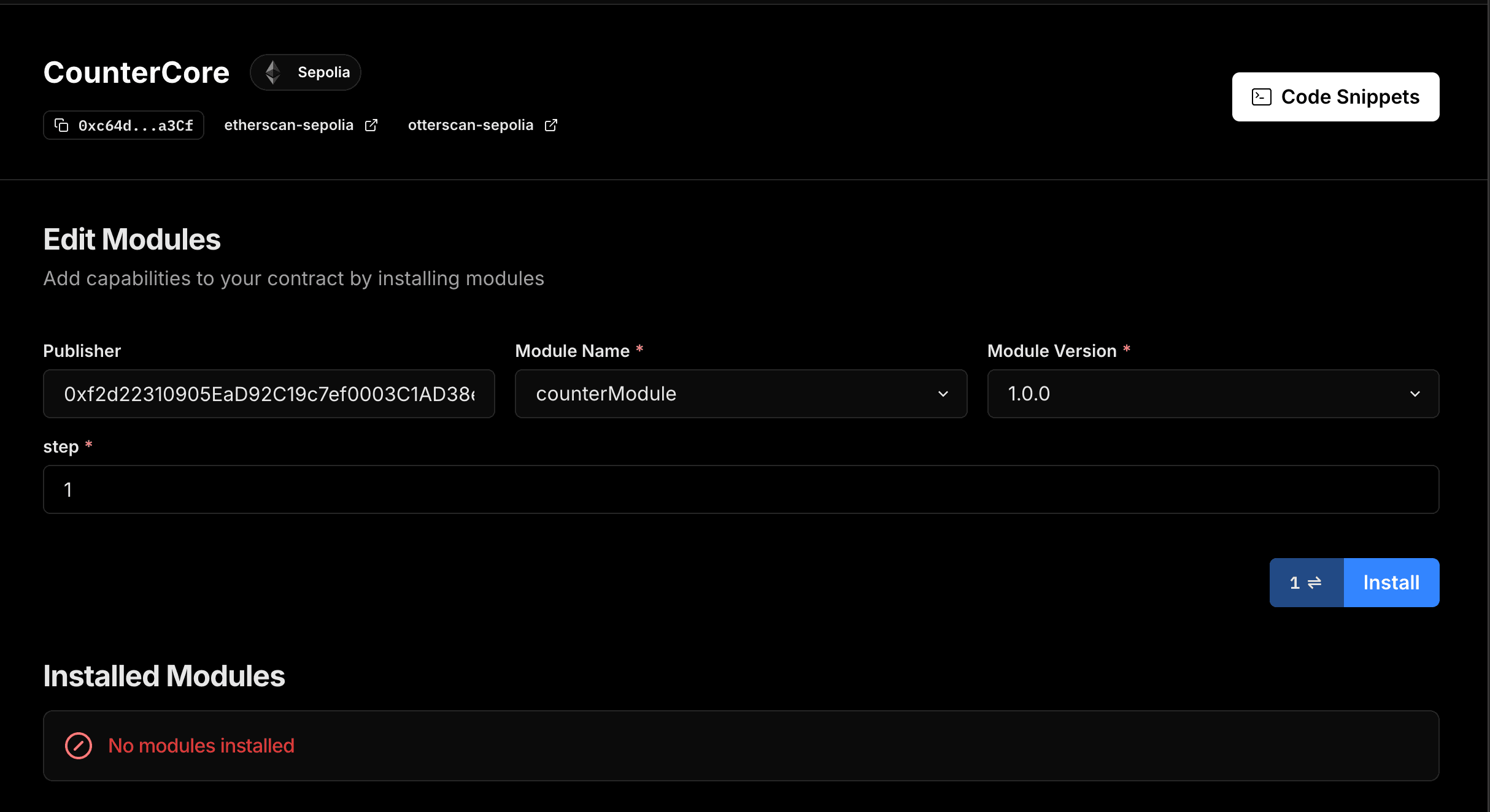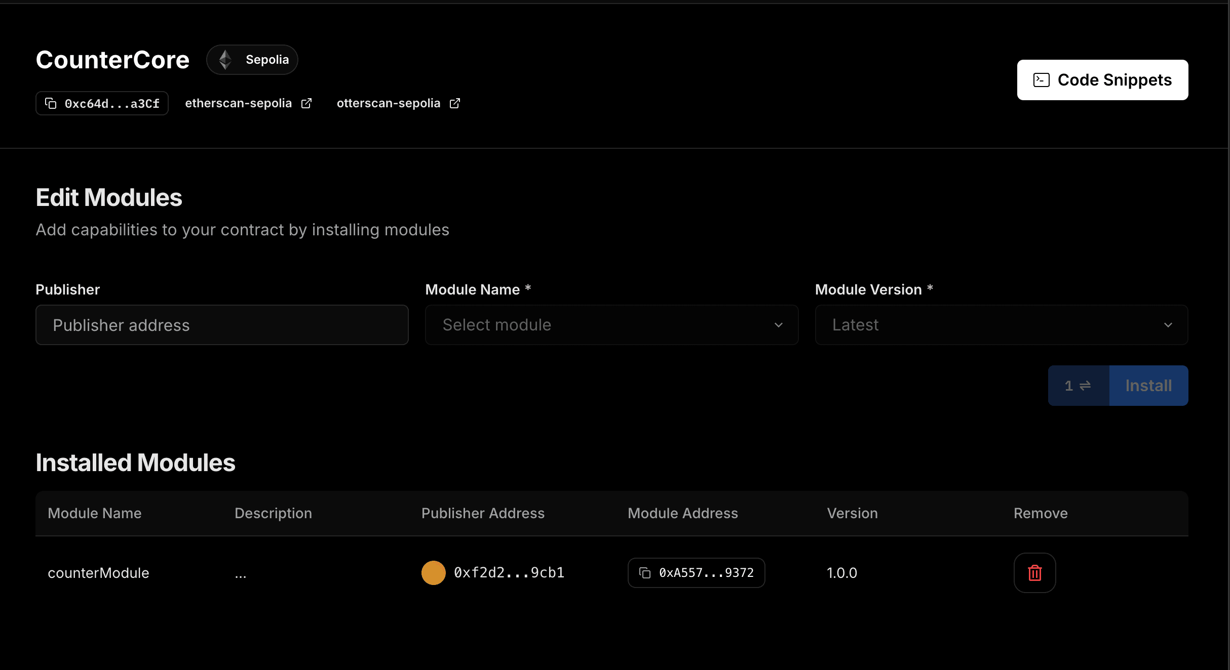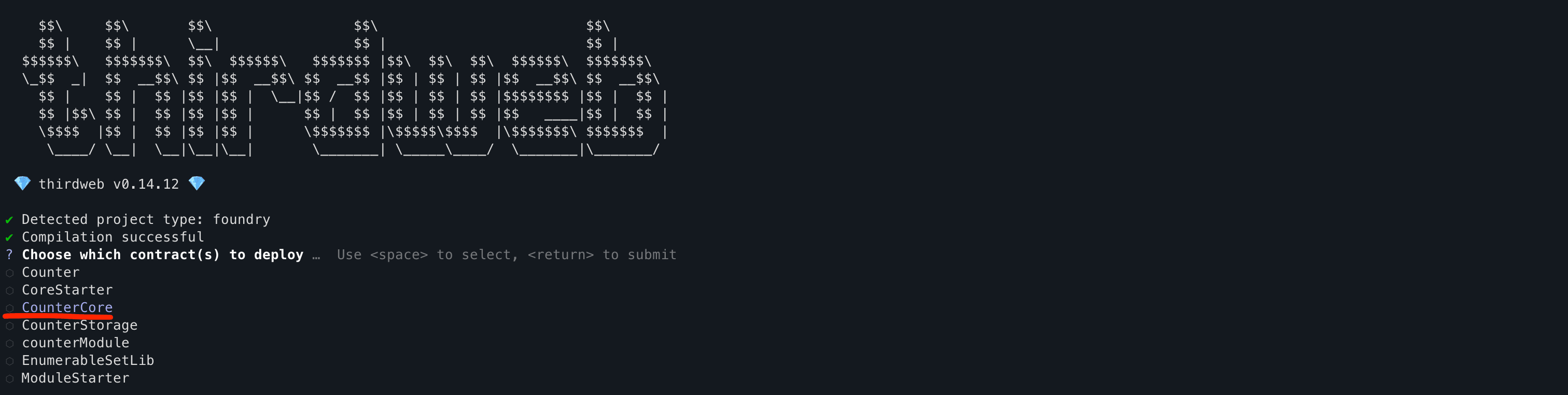 This guide will show you how to publish a Modular Contract that increments a counter. If you're interested in learning how modular contracts work, refer to How it works. If you haven't read through Create a Core Contract and Create a Module Contract, please do so before proceeding as this guide will build on top of those previous guides.